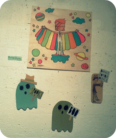 happy halloween! here is some paintings i did at a halloween show at The Bubble, cosmic david bowie and some spooky ghosts and dance zombie dance buddys. for this event i was a scray bat. found the dress at the thrift and painted my face. hope your day is spooktacular.